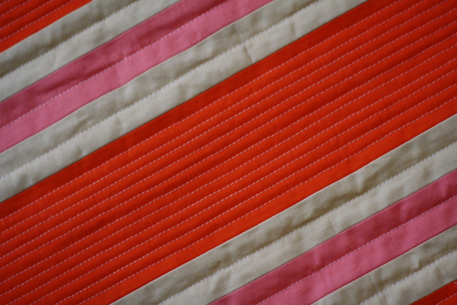 Because the design was simple, I wanted to incorporate dense quilting. I usually quilt my straight lines at 1/2″ apart, but went with 1/4″ apart on the tangerine strips. The texture is amazing! I wish you could reach out and touch the quilt in the picture to feel the ridges.