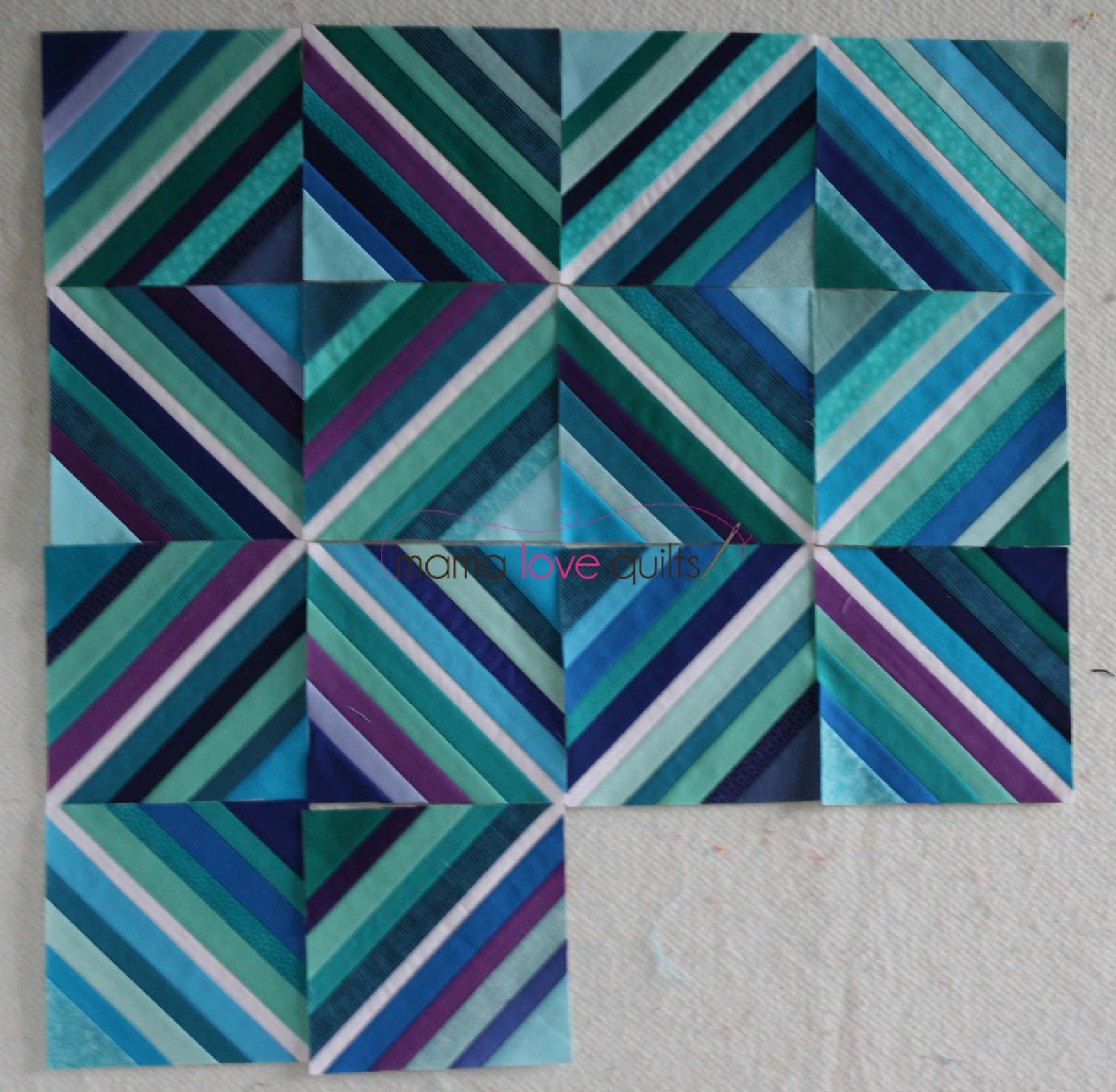 Beautiful WIP, Nicole. It's such a sophisticated look! I like that you have the white strings connecting–that will look really neat going throughout the quilt!
